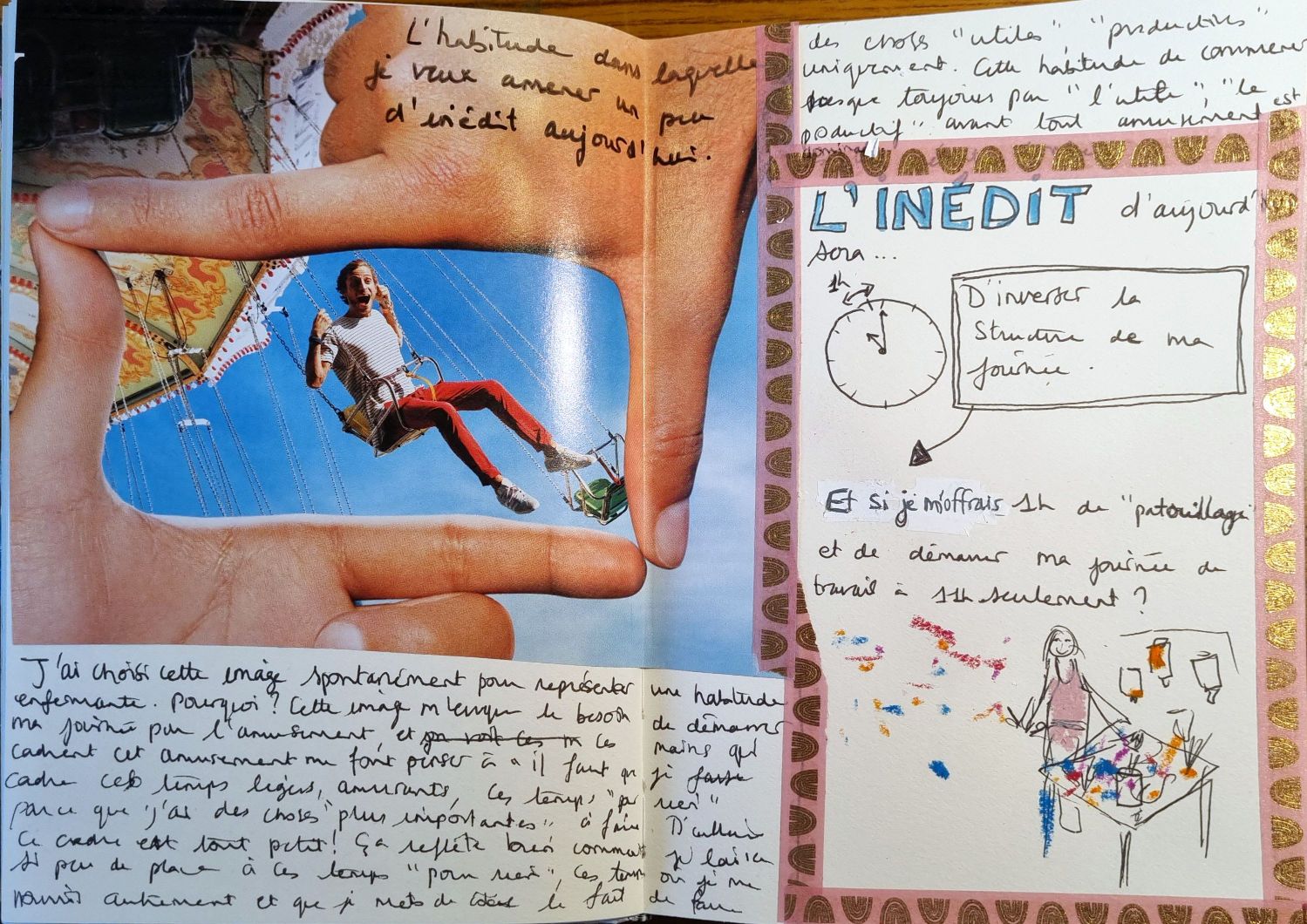 Le Journal Créatif est une forme de journal intime qui inclut non seulement l’écriture mais également le dessin et le collage entre autres. Cette puissante association entre ces trois langages permet de toucher et transformer des parties de soi inatteignables simplement par l’écriture – et ceci sans « savoir » dessiner, écrire ou faire du collage.