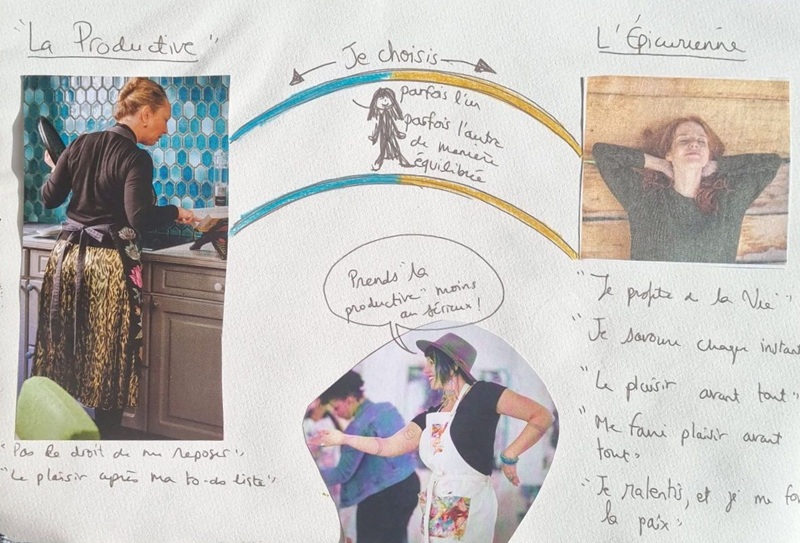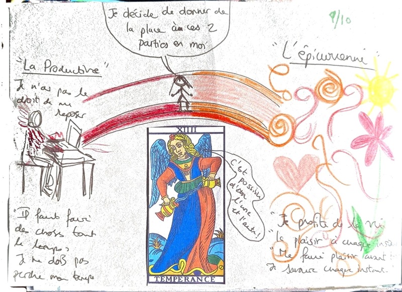 Exploration du lien entre les deux : Qu’est-ce que chacune a besoin d’entendre de l’autre ? Si elles coopéraient, que pourraient-elles créer ensemble ? Que veut dire pour moi “équilibre” aujourd’hu