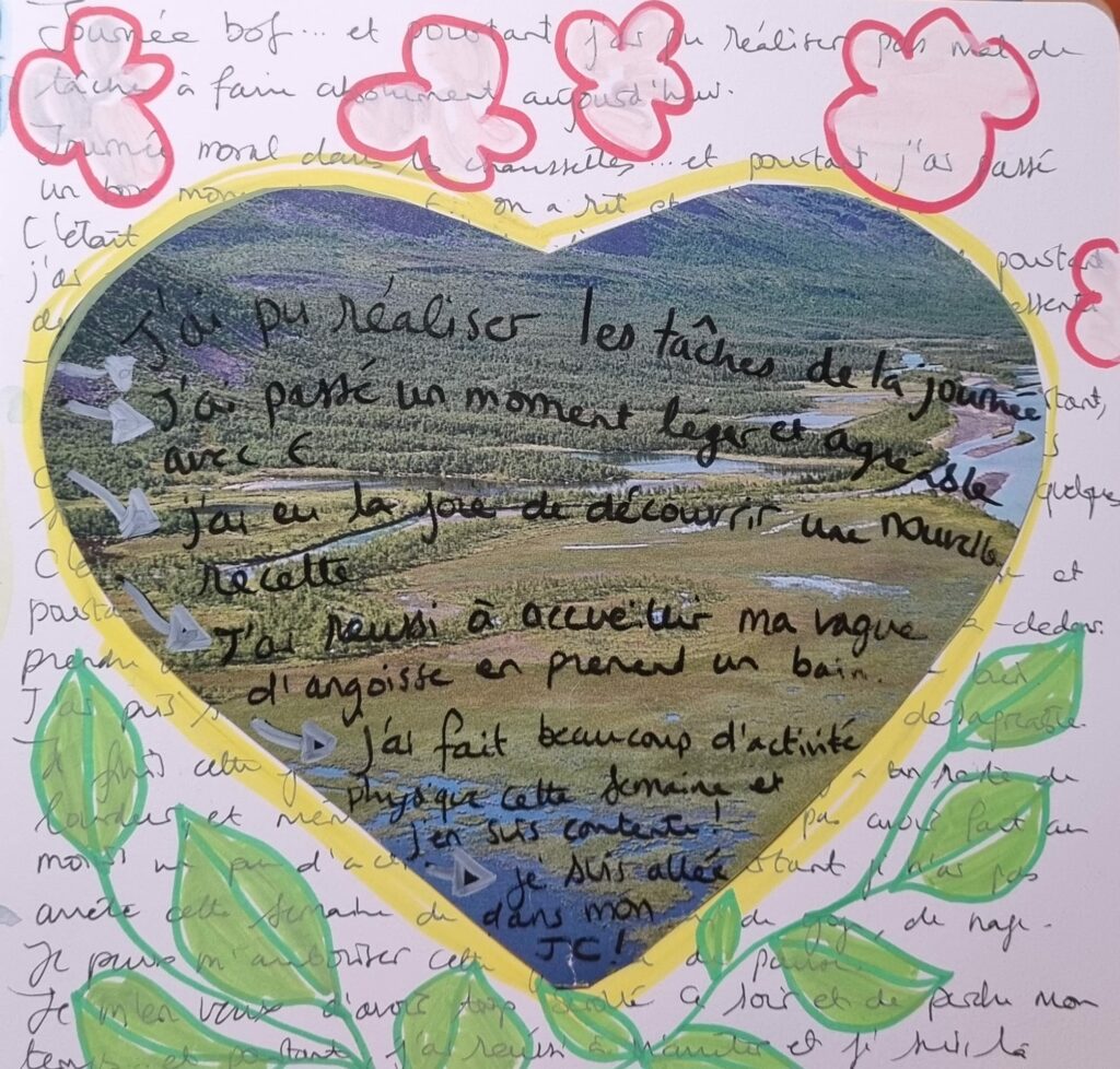 Le principe, c’est simplement de partir de là où on est et ne pas forcer quoi que ce soit. Écrivez ce qui se passe en vous, au niveau physique, émotionnel, énergétique, mental, relationnel, etc. Posez ce qui est vrai, sans rien arranger. Puis cherchez une exception, une nuance, même minuscule, quelque chose qui montre que, même dans l’état du moment, il existe autre chose aussi. L’idée c’est d’être le plus précis possible, le plus concret possible. Appuyez-vous au maximum sur le « quoi? qui? quand? où? comment? » quand vous décrivez l’exception. Ces détails ancrent l’exception dans le corps et dans la mémoire, et pas seulement dans la tête. Il n’y a pas de bonne ou de mauvaise exception. Parfois c’est un micro-détail, un geste, un regard, une sensation, un souvenir très récent. Et c’est suffisant. Ce sont justement ces petites choses, très concrètes, qui permettent au regard de se déplacer et à l’état intérieur de se desserrer doucement.
