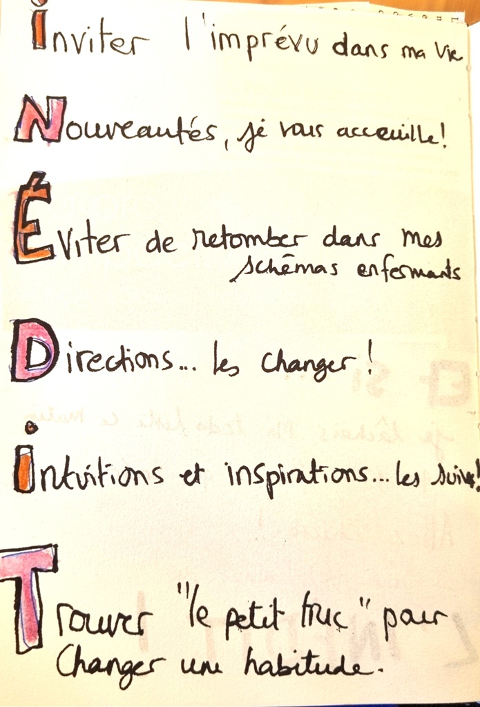 Voici un processus créatif que je trouve aidant pour d’abord identifier de manière spontanée une zone de sa vie où l’on aimerait amener un peu d’inédit et puis ensuite d’imaginer le plus petit pas possible pour le vivre! C’est tout simple, rapide et ludique, comme j’aime ❤️